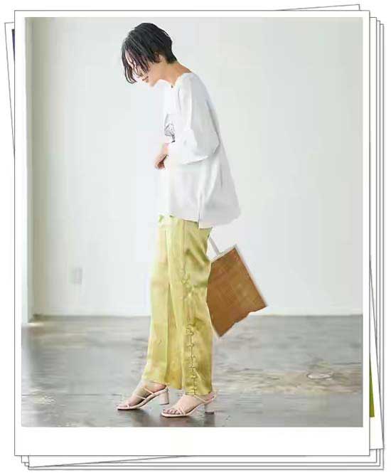 春天,你可以试试这种黄色裤子。有光泽的面料营造出轻盈成熟女性的优雅气质。因此,即使是鲜艳的颜色,也不用担心幼稚小气。如果你穿的是休闲长袖T恤,可以用高跟鞋来凸显女性气质。